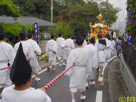 ![]() 神輿の坂の下り方 先頭を4人で支えて |